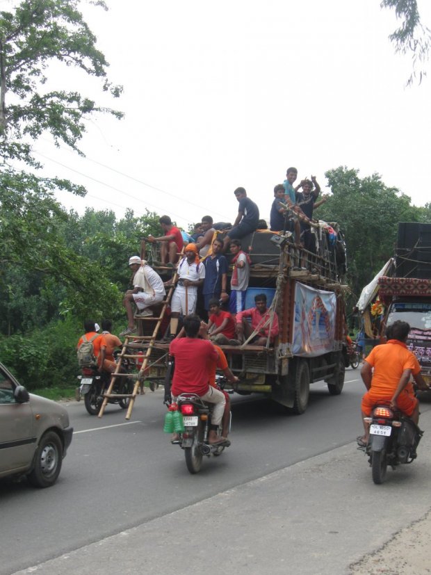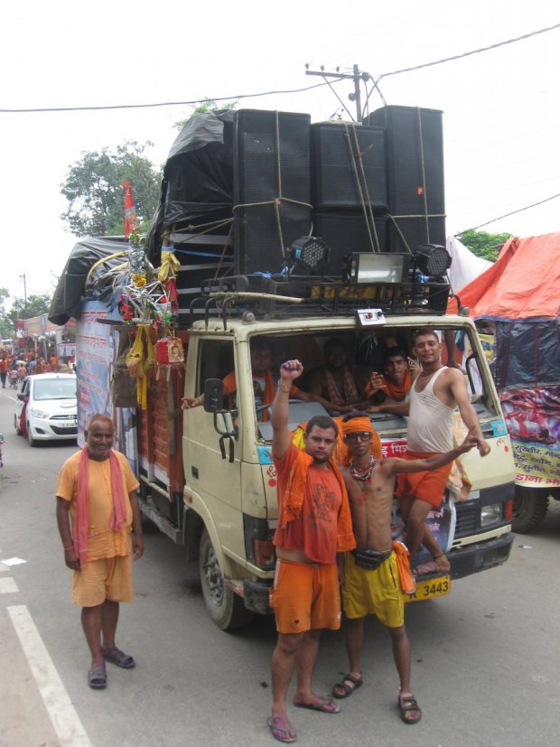 3. Pellegrini di ritorno dalla festa di Shiva ad Haridwar. Sulla strada il cammino di centinaia di migliaia di persone è accompagnato da musica mantra ma anche da musica da film di Bolliwood. (Gli altoparlanti buoni sono piu importanti, per esempio, dei parabrezza).
